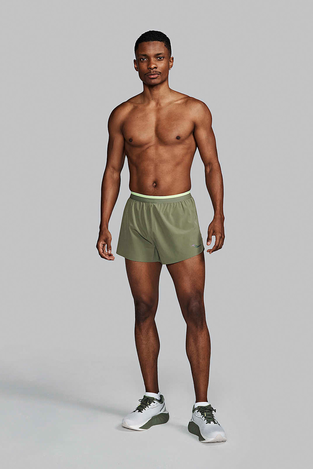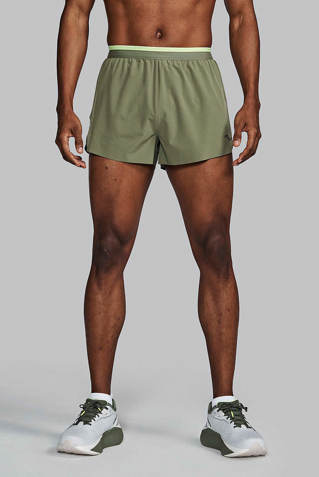 Saucony ENDORPHIN SPLIT SHORT — легкі шорти для чоловіків, ідеальні для змагань і тренувань. М'який безшовний матеріал не сковує рухів і запобігає натиранням, а перфорована задня частина забезпечує відмінну вентиляцію. У підкладці є три кишені для дрібниць, які завжди будуть під рукою під час забігу чи тренування.